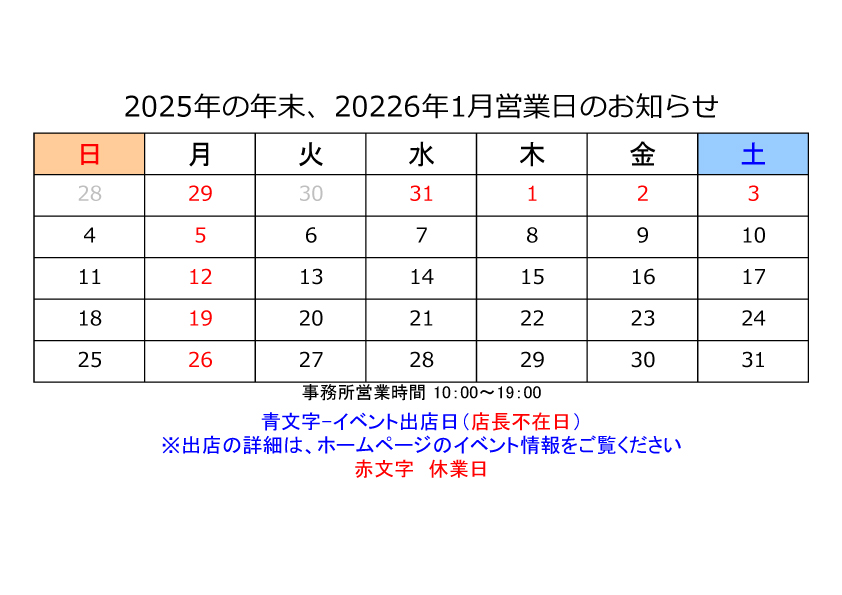 休業期間:2025年12月31日(水)〜2026年1月3日(土)